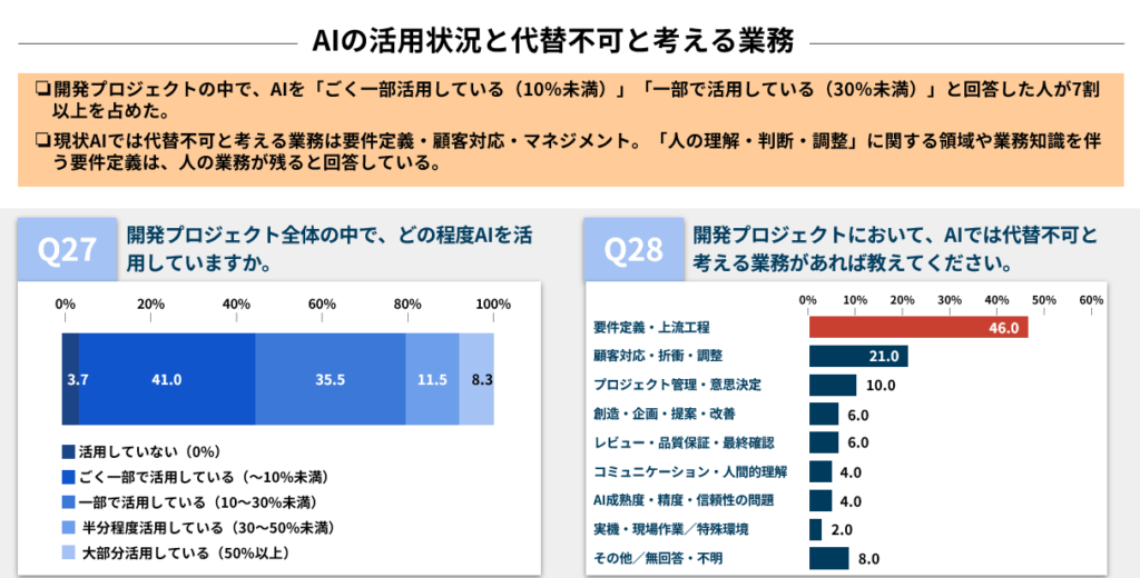 弊社の調査で、「開発プロジェクトにおいてAIでは代替不可と考える業務を教えてください(自由回答)」と尋ねた結果、多数が「要件定義・上流工程(46.0%)」を挙げました。次いで「顧客対応・折衝・調整(21.0%)」となっており、人の理解や判断、調整が不可欠な領域は、依然として人間にしかできない重要な業務として残ると予測されています。
