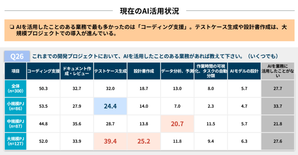 弊社が行った調査によれば、実際の開発現場でAIが活用されている業務として、最も多かったのは「コーディング支援(50.3%)」でした。これに「ドキュメント作成・レビュー(32.7%)」や「テストケース生成(32.0%)」が続いており、特に大規模プロジェクトにおいては、テストケース生成(39.4%)や設計書作成(25.2%)といった工程での導入がより進んでいる傾向にあります。